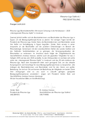 Rheuma-Liga-Bezirksleitertreffen: Mit neuem Schwung in die Herbstsaison–2020 „Interregionaler Rheuma-Gipfel“ in Innsbruck